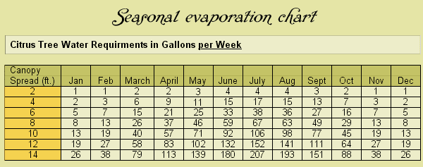 Assuming your citrus trees have been in place at least two to three years, citrus trees do best when they are flooded then allowed to dry out before re-watering. The soil composition, the drainage of the soil, the amount of rainfall you receive, and the time of year all determine how often you need to water your citrus trees. Within the Salt River Valley, soil conditions can vary. A good beginning watering schedule during the summer months (Apr - Sep) is to water the trees every 7 to 10 days. During the winter months (Nov - Feb) water the trees every 3 to 4 weeks. Over watering can be just as much of a problem as not watering enough. Obviously a wilted tree may mean a lack of moisture. Then again, too much moisture leads to root decay, with the symptoms showing a wilted appearance. This sometimes leads to a dilemma--too much or too little.